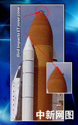 7月26日,美國“發(fā)現(xiàn)號”航天飛機從肯尼迪航天中心發(fā)射升空時,一只鳥在發(fā)射場附近飛過。當天下午的新聞發(fā)布會上,美國宇航局提供的一幅電視圖片顯示,一只鳥可能在“發(fā)現(xiàn)號”航天飛機發(fā)射的時候撞擊了燃料箱的最前端部分。與此同時,美國宇航局證實,在26日的發(fā)射升空過程中,“發(fā)現(xiàn)號”上脫落下來一小塊隔熱瓦和一大塊碎片。“發(fā)現(xiàn)號”底部擋熱板可能有兩處遭到了破壞。