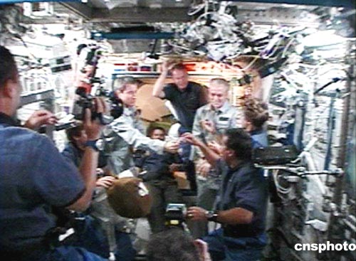 航天飛機(jī)發(fā)現(xiàn)號是7月28日7時18分(北京時間19時18分)和國際空間站軌道對接,經(jīng)過密封檢查,機(jī)組于美國東部時間8:50進(jìn)入國際空間站。七名宇航員結(jié)束了兩天奔向空間站的飛行,這是自美國航天飛機(jī)2002年12月離開后,如今第一次造訪空間站。兩個機(jī)組會師太空,相互擁抱問候。