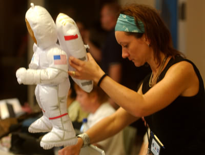 中新網(wǎng)洛杉磯七月二十九日電(記者賈國榮)一位美國女記者期待發(fā)現(xiàn)號首次太空行走成功,特意舉起一個(gè)準(zhǔn)備太空行走的宇航員卡通人,放在電腦前。