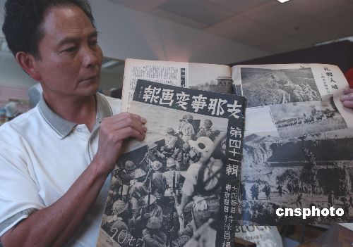 | 美國舊金山華人收藏家姜家聲展示在舊貨市場尋求的《支那事變畫報(bào)》,此為日本侵略中國和亞洲時(shí)期顯示戰(zhàn)功的出版物。姜家聲先生在今年七月紀(jì)念中國抗日戰(zhàn)爭勝利六十周年時(shí),用以揭露日本發(fā)動(dòng)戰(zhàn)爭的罪惡行徑。作者:賈國榮