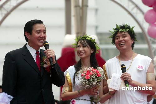 七月三十日,“戀戀愛之船-市民聯(lián)合婚禮”在臺(tái)北美麗華百樂園摩天輪廣場(chǎng)舉行,三十四對(duì)新人在此喜結(jié)良緣。臺(tái)北市長(zhǎng)馬英九(左)在婚禮上當(dāng)眾向新人提問題,“刁難”新人。作者:盛佳鵬