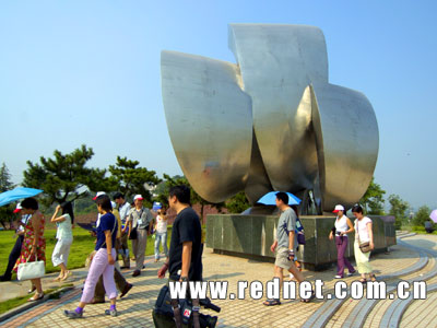 記者們在蒸水風(fēng)光帶從一尊名為“風(fēng)調(diào)雨順”的雕塑下走過