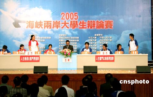 七月三十一日,海峽兩岸大學(xué)生辯論賽首次在臺北劍潭青年活動(dòng)中心鳴鑼。兩岸十二所知名高校計(jì)六十一名學(xué)子參賽。圖為開幕當(dāng)日,兩岸辯手舉行表演示范賽。作者:董會(huì)峰