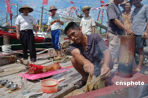 八月一日南海開(kāi)漁。已休息了兩月之久的廣東陽(yáng)江海陵島閘坡漁港的漁民們,在揚(yáng)帆起航前舉辦隆重拜祭船頭儀式,以祈求平安吉利魚(yú)滿(mǎn)艙。圖為漁民在船頭拜訪(fǎng)拜祭用品。作者:索有為