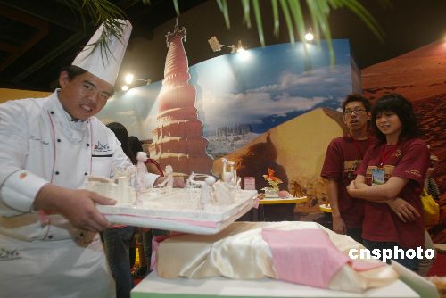 八月四日,二○○五年臺北“中華美食展”在臺北世貿中心開幕,在美食展中舉行的廚藝邀請賽中,來自大陸的廚師展示了精湛廚藝,吸引了不少參觀者,也吸引了同行來學藝。作者:盛佳鵬