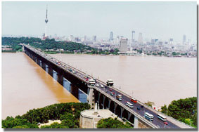 長江大橋連結(jié)漢陽和武昌的龜蛇二山,橫跨萬里長江之上。是我國長江上第一座公鐵路兩用橋。它建于1955年9月,1957年10月正式通車。全橋長1670。4米,正橋長1156米,8墩9孔。橋身分為兩層,上層為公路橋,車道寬18米,可容6輛汽車并行;下層為鐵路雙軌橋,南北火車各行其道。鐵橋下凈高,在水位最高時仍可通行萬噸巨輪。