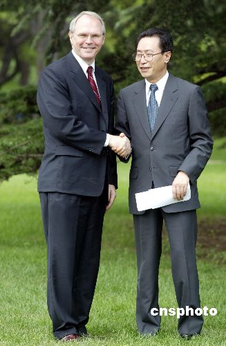 八月七日,中國外交部副部長、六方會談中國代表團團長武大偉在會見記者后與美國代表團團長希爾握手致意。作者:廖文靜