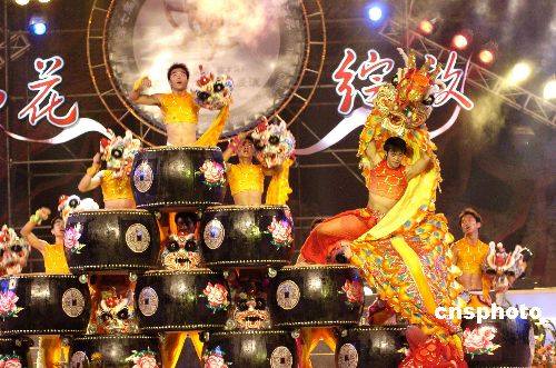 第七屆中國(guó)民間文藝山花獎(jiǎng)·民間藝術(shù)表演獎(jiǎng),八月六日晚在廣東東莞樟木頭降下帷幕,云南的《跳菜舞》、廣東湛江的《雷州雄師展英姿》、廣東東莞的《麒麟戲錢(qián)鼓》等十個(gè)作品獲得優(yōu)秀作品獎(jiǎng)。圖為廣東東莞樟木頭麒麟代表隊(duì)在閉幕式上表演他們的獲獎(jiǎng)作品《麒麟戲錢(qián)鼓》。作者:羅仰明