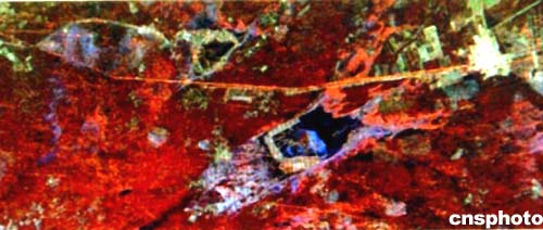 俄羅斯宇航員在國(guó)際空間站的奮進(jìn)號(hào)艙內(nèi)拍攝的中國(guó)西部一段長(zhǎng)城,橫貫中上部的桔紅色長(zhǎng)城地段,距北京約四百英里。作者:賈國(guó)榮