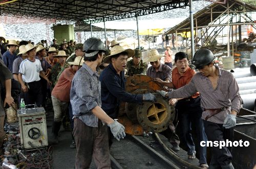 從江西省調(diào)來的二臺七百二十五千瓦大功率抽水機八月九日到達(dá)廣東省興寧事故煤礦,以加快透水事故礦井的抽水進度。目前,一百零二名礦工仍被困井下。作者:羅仰明
