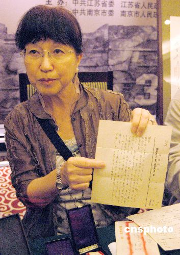 圖:日本松岡環(huán)女士展示南京大屠殺歷史證物