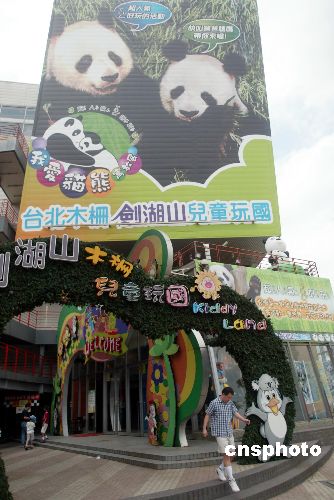 八月九日,臺(tái)北木柵劍湖山兒童玩國(guó)正在進(jìn)行“我愛(ài)貓熊寓教展”,其游樂(lè)設(shè)施從各個(gè)方面介紹大熊貓,供參觀者參觀。圖為臺(tái)北木柵劍湖山兒童玩國(guó)在門(mén)口樹(shù)立的大幅熊貓宣傳海報(bào)。作者:盛佳鵬