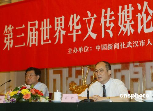 八月十二日,國務(wù)院僑辦副主任趙陽(右)、中共武漢市委副書記殷增濤(左)出席在北京人民大會(huì)堂舉行的“第三屆世界華文傳媒論壇”新聞發(fā)布會(huì)。由中國新聞社、武漢市人民政府主辦的“第三屆世界華文傳媒論壇”將于九月十一日在武漢市召開。作者:史利