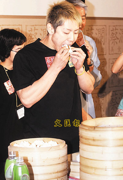 一身T恤和短褲打扮的小林尊昨午在“大食一番爭霸戰(zhàn)”決賽上,氣定神閑地上場,面對主辦方準(zhǔn)備的叉燒包,面無懼色,不慌不忙的開始競食。只見他先將叉燒包掰成兩半,把包子在兩手中稍微捏小一點,便送入口,再喝一口水,頸一仰、頭一低,幾秒鐘內(nèi)一個叉燒包就吞入肚。