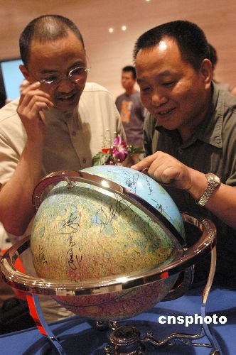 用于科研和廣大科學(xué)愛好者使用、明確標(biāo)志月球表面地形構(gòu)造和地域署名的,中國第一個(gè)“月球儀”,八月十五日在北京市中華世紀(jì)壇舉行的,中國“2005年月球探測(cè)工程標(biāo)識(shí)征集活動(dòng)啟動(dòng)儀式”發(fā)布會(huì)上亮相!霸虑騼x”由中科院月球探測(cè)中心制作。中國月球探測(cè)工程又稱“嫦娥工程”,分“繞”、“落”、“回”三期,由長(zhǎng)征三甲火箭擔(dān)綱,分別在2007年前、2012年前、2017年前后發(fā)射!版隙鹨惶(hào)”(CH-1)衛(wèi)星,選用東方紅3號(hào)(DFH-3)衛(wèi)星平臺(tái)。作者:鄒憲