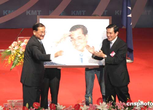 當(dāng)?shù)貢r(shí)間十九日上午,中國(guó)國(guó)民黨舉行主席交接儀式,連戰(zhàn)正式交棒給新任主席馬英九。連戰(zhàn)在交接現(xiàn)場(chǎng)收到黨部贈(zèng)送的“神秘禮物”——他自己的大幅拼貼照片。作者:趙海燕