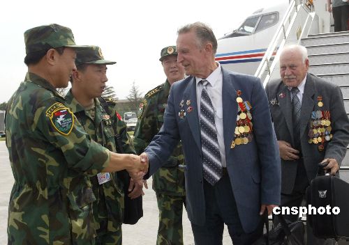 紀(jì)念反法西斯戰(zhàn)爭勝利暨抗日戰(zhàn)爭勝利六十周年之際,被邀請觀摩“和平使命—2005”中俄聯(lián)合軍事演習(xí)的俄羅斯十名前蘇聯(lián)二戰(zhàn)時(shí)期老戰(zhàn)士,八月十九日踏上中國的土地。他們各個(gè)胸前掛滿勛章,標(biāo)志二戰(zhàn)時(shí)期曾有的輝煌。圖為解放軍到青島機(jī)場迎接老戰(zhàn)士。作者:王麗南