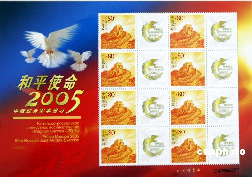 中俄聯(lián)合軍事演習(xí)導(dǎo)演部和中國(guó)集郵總公司19日聯(lián)合發(fā)行“和平使命—2005”中俄聯(lián)合軍事演習(xí)紀(jì)念封1枚和專題紀(jì)念封4枚,以紀(jì)念“和平使命—2005”中俄聯(lián)合軍事演習(xí)。這5枚紀(jì)念封以精裝卡書(shū)和簡(jiǎn)裝卡書(shū)兩種方式裝幀。圖為精裝卡書(shū)中的一版8枚個(gè)性化郵票。作者:王麗南