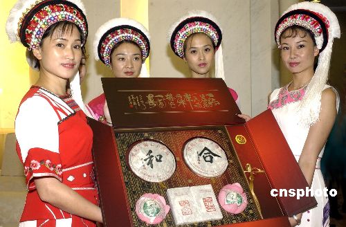八月二十日,來自云南的白族姑娘在北京人民大會堂向來賓展示“天下和合,兩岸沁香”云南典藏普洱茶。據(jù)介紹,此次發(fā)行的典藏普洱茶,意在以茶會友,寄情兩岸,企盼祖國早日統(tǒng)一的愿望。作者:韓藝冰