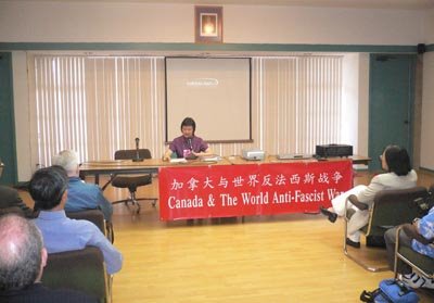 圖片展期間,中國總領(lǐng)館邀請有關(guān)學(xué)者和卑詩省抗日戰(zhàn)爭史實(shí)維護(hù)會的負(fù)責(zé)人舉辦三場抗戰(zhàn)史實(shí)講座,主題是《加拿大與世界反法西斯戰(zhàn)爭》。中新社記者呂振亞攝