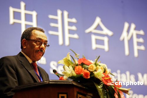 8月22日,為期兩天的中非合作論壇第四屆高官會(huì)在北京開(kāi)幕,來(lái)自中國(guó)和非洲46個(gè)國(guó)家的代表、6個(gè)非洲地區(qū)組織的觀察員以及非洲駐華使節(jié)出席了開(kāi)幕式。中非合作論壇是中國(guó)和非洲于2000年共同創(chuàng)立的集體對(duì)話與合作機(jī)制,已分別舉辦了兩屆部長(zhǎng)級(jí)會(huì)議。圖為論壇共同主席國(guó)、埃塞俄比亞政府論壇特使海爾基洛斯·格塞塞在開(kāi)幕式上致辭。作者:武仲林