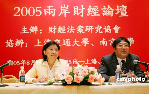 八月二十二日,“二○○五兩岸財(cái)經(jīng)論壇”在上海舉行,多名中國國民黨籍、親民黨籍“立委”以及三十多名臺灣金融界知名人士出席了本次論壇。圖為親民黨籍“立委”劉憶如(圖左)與上海交大安泰管理學(xué)院院長(右)王方華在本次論壇上。作者:湯彥俊