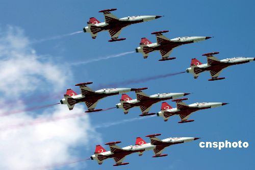F1大獎賽土耳其站正式比賽結(jié)束21日晚。邁凱輪車隊的芬蘭車手雷克南一路領先,并率先完成比賽獲得首屆土耳其大獎賽的冠軍。法拉力車隊的七次世界冠軍舒馬赫因撞車推出了比賽。圖為開幕式上土耳其空軍表演隊列隊表演,為比賽助興。作者:Ic/cnsphoto