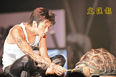 中新網(wǎng)8月23日電 據(jù)文匯報(bào)報(bào)道,達(dá)明一派與謝霆鋒首度合作的“同場(chǎng)異夢(mèng)音樂會(huì)”,前晚在會(huì)展舉行,近年人氣不繼的霆鋒,為求搶鏡竟連家中的八十磅巨龜也要出動(dòng),又罔顧觀眾安危,突然飛身跳向觀眾席的觀眾,累及部分觀眾跌地上,幸好未有釀成意外。
