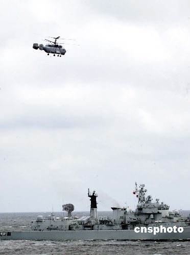 二十三日,“和平使命——2005”中俄聯(lián)合軍事演習(xí)第三階段——實施交戰(zhàn)的海上封鎖演練在中國黃海海域進(jìn)行。圖為直升飛機釋放聲納,搜尋潛艇,與艦艇聯(lián)合反潛。作者:王麗南