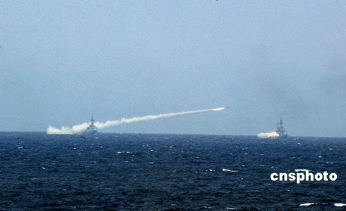 八月二十三日,“和平使命——2005”中俄聯(lián)合軍事演習第三階段在中國山東半島及其附近海域進行。圖為多艘護衛(wèi)艦齊射艦艦導彈。作者:王麗南