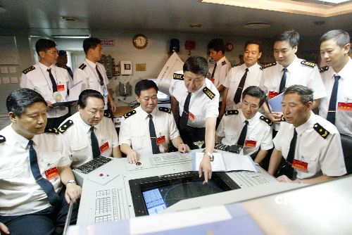 “和平使命-2005”中俄聯(lián)合軍事演習(xí)第三階段23日在中國山東半島及其附近海域開始。圖為參加演習(xí)的中國北海艦隊(duì)指揮員在指揮倉內(nèi)指揮演習(xí)的情景。作者:王麗南