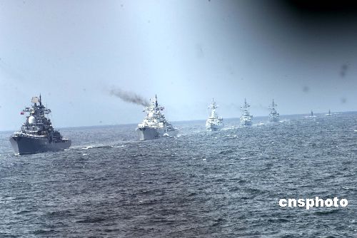 “和平使命-2005”中俄聯(lián)合軍事演習第三階段8月23日在中國山東半島及其附近海域舉行。圖為參加演習的中俄艦艇形成隊列,接受聯(lián)合導演部檢閱。作者:王麗南