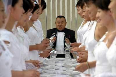 昨天,奧體中心游泳館的一個(gè)平臺(tái)上,一下子出現(xiàn)了三十位身穿白色婚紗的新娘,這個(gè)場面難道是有人在這里組織集體婚禮?看到一旁的攝影機(jī),才知道原來這里是潘長江處女專輯《男人40一枝花》同名歌曲MV的拍攝現(xiàn)場。一張長條桌子兩側(cè)站著30位漂亮的新娘,而眾星捧月之中是身穿黑色燕尾服的笑星潘長江。最搞笑的是當(dāng)老潘揭開面前一只巨大的盤子蓋,原以為是大餐的他失望地發(fā)現(xiàn)里面只放著一個(gè)小漢堡。