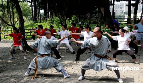 八月二十四日,河南嵩山少林寺武僧團(tuán)在臺(tái)灣開展武術(shù)交流活動(dòng)時(shí)與臺(tái)北武術(shù)愛好者同場(chǎng)習(xí)武。圖為十歲的孫家閎(右)和少林寺延路法師(左)一起演習(xí)少林通臂拳。作者:趙海燕