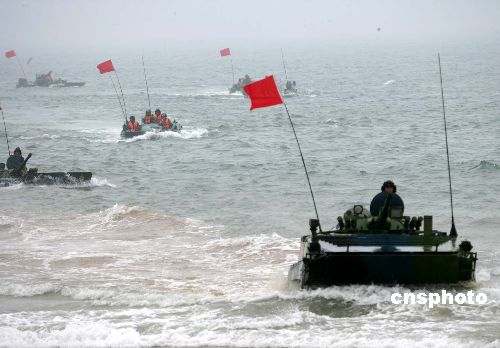 八月二十四日,“和平使命—2005”中俄聯(lián)合軍事演習(xí)第三階段兩棲登陸作戰(zhàn)實兵演練在山東半島展開,參加兩棲登陸作戰(zhàn)實兵演練的中國海軍陸戰(zhàn)隊水陸坦克向岸邊突擊。作者:王麗南
