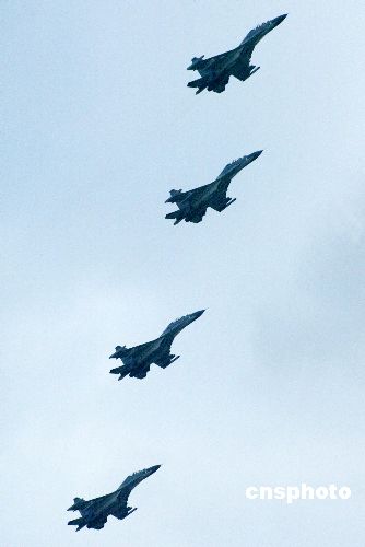 八月二十四日,“和平使命—2005”中俄聯(lián)合軍事演習(xí)第三階段兩棲登陸作戰(zhàn)實兵演練在山東半島展開。圖為參加兩棲登陸作戰(zhàn)實兵演練的中國空軍殲擊機四機編隊飛臨演習(xí)地域上空。作者:王麗南