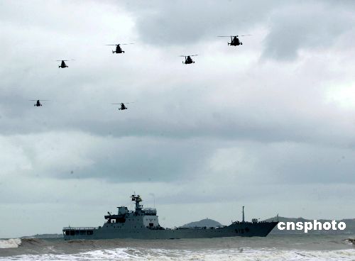 八月二十四日,“和平使命—2005”中俄聯合軍事演習兩棲登陸作戰(zhàn)實兵演練在山東半島展開。圖為參加兩棲登陸作戰(zhàn)演練的直升機在風云變幻的海天間掩護俄羅斯艦艇前進。作者:王麗南