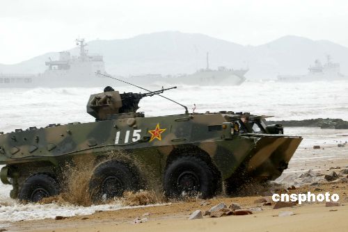 八月二十四日,盡管山東半島天氣惡劣“和平使命—2005”中俄聯(lián)合軍事演習(xí)兩棲登陸作戰(zhàn)實兵演練如期進(jìn)行。圖為參加兩棲登陸作戰(zhàn)演練的裝甲車搶灘登陸。作者:王麗南