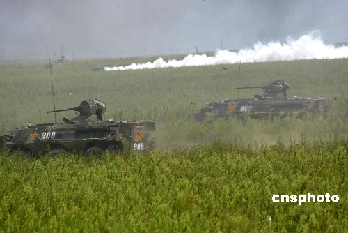 8月25日,參加強(qiáng)制隔離實(shí)兵演習(xí)的中方部隊(duì)裝甲戰(zhàn)車在煙障掩護(hù)下向目標(biāo)發(fā)起攻擊。當(dāng)日上午,“和平使命——2005”中俄聯(lián)合軍事演習(xí)最后一個(gè)戰(zhàn)術(shù)行動(dòng)課目——強(qiáng)制隔離作戰(zhàn)演練在濟(jì)南軍區(qū)濰北靶場(chǎng)舉行。作者:王麗南