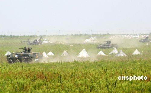 “和平使命——2005”中俄聯(lián)合軍事演習強制隔離演練8月25日在在山東半島舉行。圖為聯(lián)合演習部隊裝甲車密集炮火攻擊敵機場,消滅機場頑敵。作者:王麗南
