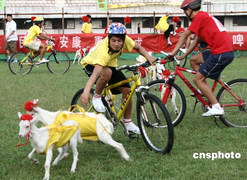 8月26日,“全國首屆自行車叼羊大賽”在山東省棗莊市舉行。比賽規(guī)定每次上場的2支參賽隊各派出4名自行車隊員,參賽隊員只有把代表自己隊伍顏色的5只小山羊叼回“羊圈”后,才有權(quán)去叼那只“公共羊”,最先叼回“公共羊”的代表隊獲勝。這次共有10支自行車代表隊參加了角逐比賽。作者:吉喆