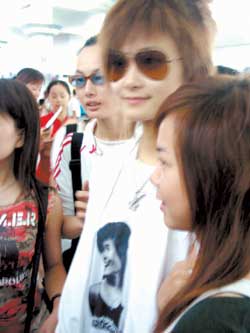 因?yàn)樵陂L沙和李宇春同住一個酒店,記者看見前天晚上11點(diǎn)多還有人在李宇春住的“金牛座”門口守著,他們打算徹夜守在這里。昨天早上6點(diǎn)15分左右,記者退房途經(jīng)李宇春的“金牛座”,門口卻看不到一個人影,本以為“玉米”們都扛不住了,誰知當(dāng)記者7點(diǎn)10分到達(dá)長沙機(jī)場時,看到十幾個穿著黃色衣服的“玉米”手捧鮮花和禮物已經(jīng)等在機(jī)場大廳了。