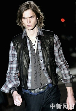 1月17日,在意大利米蘭舉行的2006/07秋冬男裝發(fā)布會(huì)上,一名模特在展示Gucci服裝。
