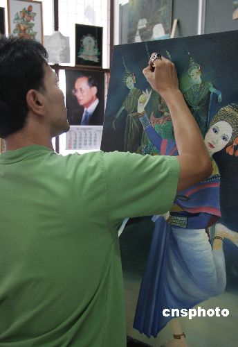泰國巴蜀府華欣縣的汪蓋崗翁衛(wèi)星遠(yuǎn)程教育電視臺開播有一個職業(yè)教育頻道,以先進的衛(wèi)星通訊技術(shù),使職業(yè)技能學(xué)習(xí)更為廣泛地深入全社會。這個頻道已開設(shè)繪畫、烹飪、縫紉、電子、計算機等各種實用課程,備受歡迎。圖為汪蓋崗翁衛(wèi)星遠(yuǎn)程教育電視臺繪畫班的一名學(xué)員,正在繪畫泰國古裝美女起舞圖,墻上則掛著這家教育臺的發(fā)起創(chuàng)辦者普密蓬國王的畫像掛歷。作者:羅欽文