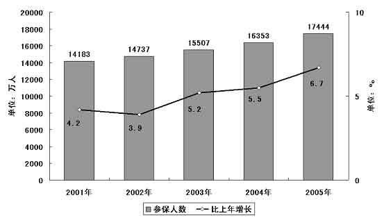圖表九 “十五”期間基本養(yǎng)老保險(xiǎn)參保人數(shù)及其增長(zhǎng)情況