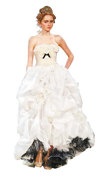近日,2006年國際婚紗博覽會在北京舉行。與國際大品牌一片復(fù)古的維多利亞式風(fēng)格不同,中國的婚紗流行趨勢展現(xiàn)了一種民族化的特色,這類中西結(jié)合的婚紗將中式的含蓄與西式的浪漫融于一體。