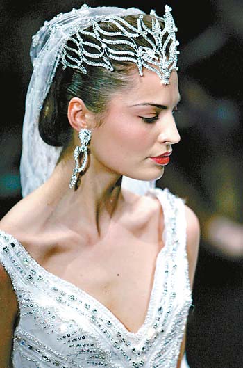 復(fù)古式維多利亞風(fēng)格的流行關(guān)鍵之一便是夸張的頭飾,因此從今年春夏的大牌婚紗新款中可以看到,除了層層疊疊的裙擺之外,新娘們的頂上功夫也絲毫含糊不得。設(shè)計款式奇特的夸張頭飾成了婚紗絕妙的點睛之筆,其中最為熱門的是花朵造型以及流線型的鉆石頭飾,而這些頭飾大得足以遮蓋住新娘的大半個頭頂,與之相搭配的耳環(huán)和項鏈也以大為美。不僅如此,大牌設(shè)計師還搬出了堪稱“母級收藏”的頭飾,像ChristianLacroix的婚紗模特頭上戴著一頂綴滿綠寶石的黃銅色后冠,頗有復(fù)古風(fēng)采。