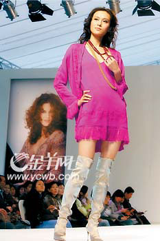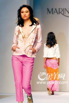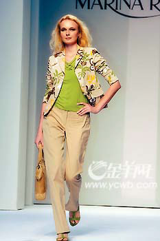 幾大品牌紛紛提倡“拜金”,卻各有“金招”,其中最出位的要屬MARINA RINALDI。但見普通的白襯衫被釘上了金色鉚釘,休閑長褲的外側(cè)爬滿金光閃閃的蝴蝶與花草,長長的頸巾布滿了金色閃片,針織背心的肩頭被金屬片飾加以勾勒,就連風(fēng)衣前襟都散落著大大小小的金屬閃片,令人拍案叫絕。