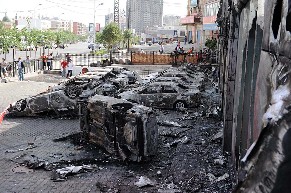 7月7日,新疆烏魯木齊市的一家吉利汽車4S店情景。該店在5日發(fā)生的暴力事件中被犯罪分子縱火焚燒,店內(nèi)外的新車全部被毀。中新社發(fā) 廖攀 攝