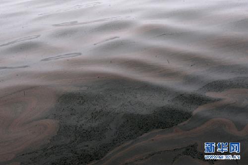 資料圖片:大連新港輸油管道爆炸后海面上大片的油污(7月17日攝)。大連新港輸油管線爆炸起火事故,至少已造成附近海域50平方公里的海面污染,海上清污工作17日全面展開。新華社記者 任勇攝